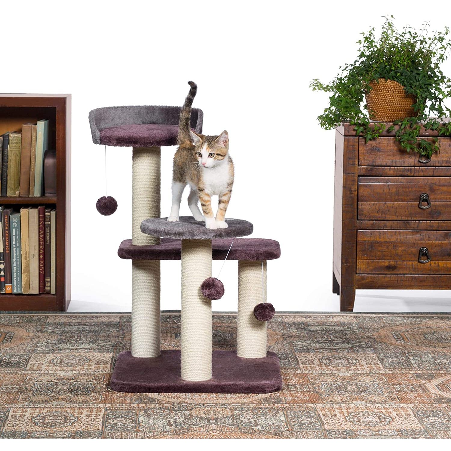 Prevue Pet Products Kitty Power Paws Leopard Terrace 7300 combines plush fabrics with durable jute to provide the perfect place for sleeping, scratching and playing. A luxurious leopard print bolstered day bed is great for surveying surroundings or taking a cat nap. 2 swat toys hang playfully while jute rope scratching posts offer an appealing texture to cats, curbing inappropriate scratching. An additional platform provides opportunities for pouncing and jumping. 20 1/2'' Long, 17 1/2'' Wide and 21'' High.