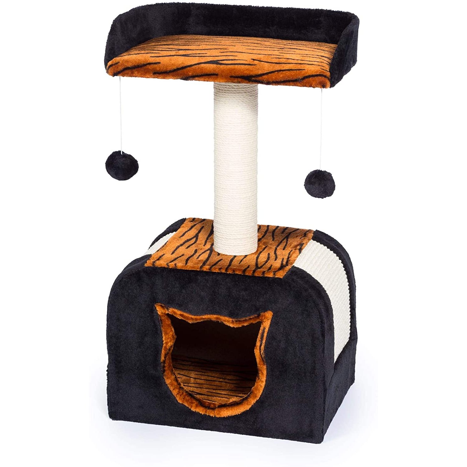 Prevue Pet Products Kitty Power Paws Leopard Terrace 7300 combines plush fabrics with durable jute to provide the perfect place for sleeping, scratching and playing. A luxurious leopard print bolstered day bed is great for surveying surroundings or taking a cat nap. 2 swat toys hang playfully while jute rope scratching posts offer an appealing texture to cats, curbing inappropriate scratching. An additional platform provides opportunities for pouncing and jumping. 20 1/2'' Long, 17 1/2'' Wide and 21'' High.